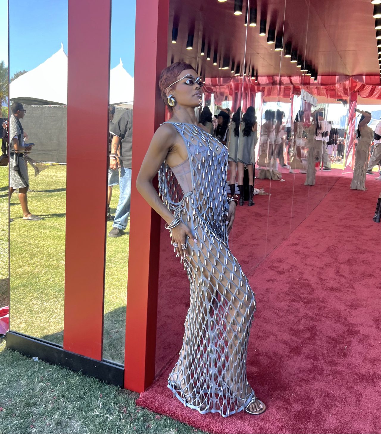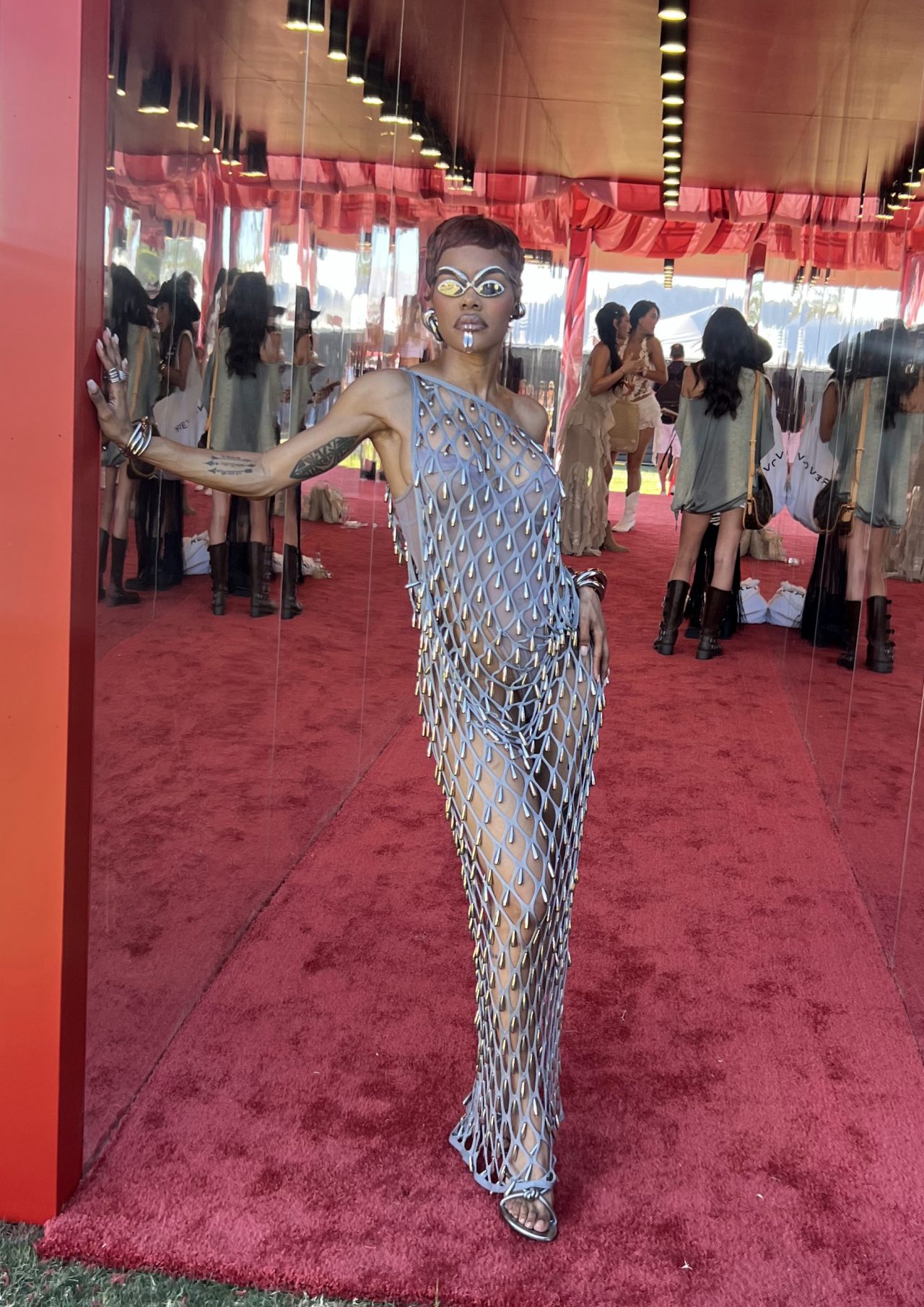 Целиот изглед го надополни со внимателно одбрани детали. Особено се издвојуваа футуристичките очила за сонце од куќата на “Скијапарели”, кои беа многу впечатливи и тешко беше да не се забележат. Покрај нив, таа носеше и пирсинг на усните, како и помасивен накит во форма на нараквици, обетки и прстени, што дополнително го нагласуваше нејзиниот смел и експериментален стил.