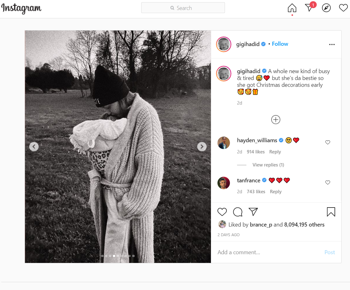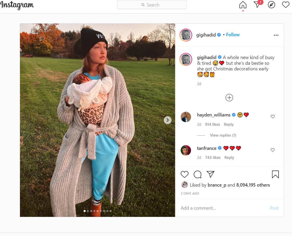 Џиџи Хадид можеби не го откри името или лицето на својата ќерка, но не се двоуми да сподели мали моменти од нејзиниот секојдневен живот како нова мајка. Пред неколку месеци, таа ја објави својата прва семејна фотографија со новороденчето и Зејн Малик за Ноќта на вештерките.