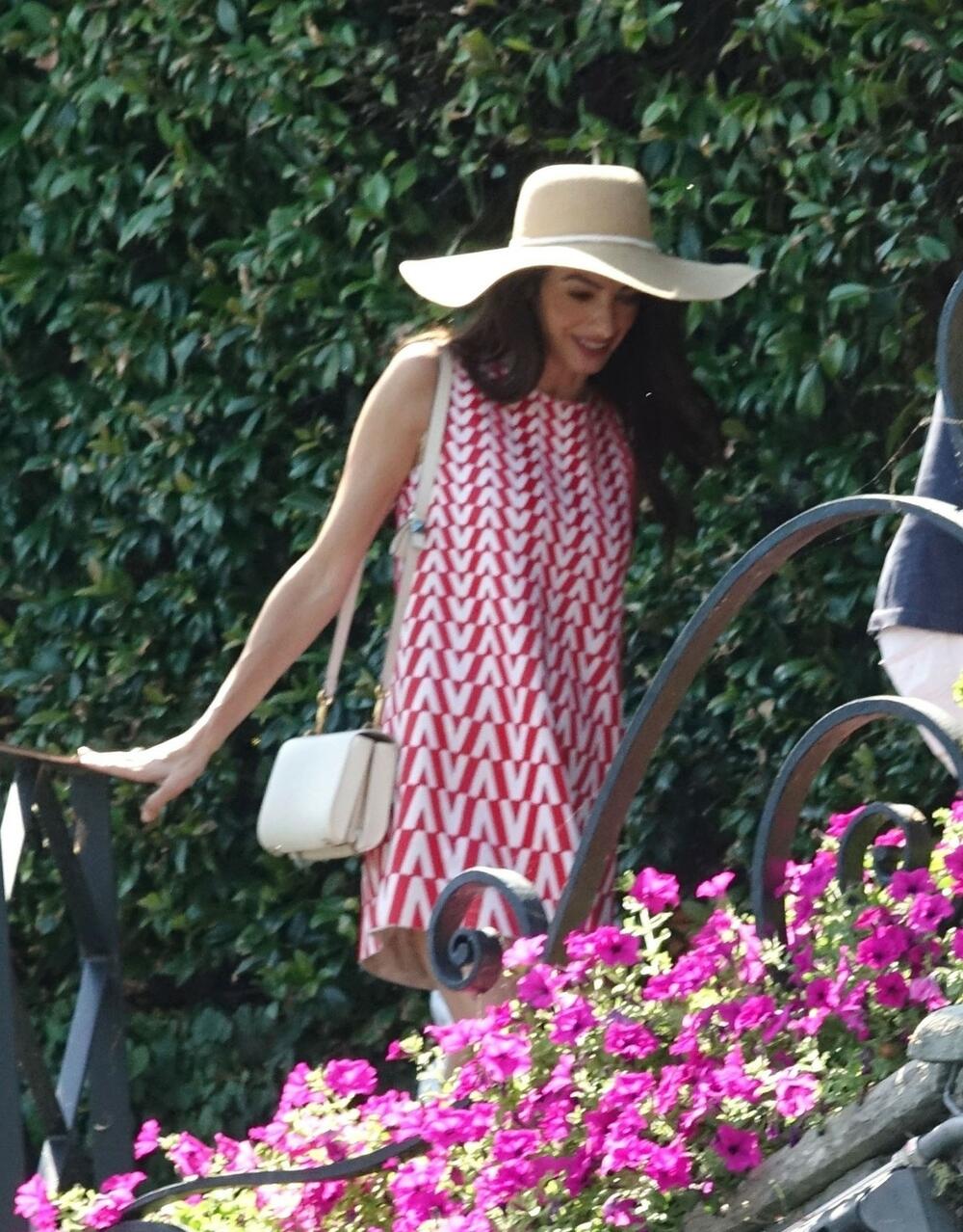 Сопругата на Џорџ Клуни, Амал повторно воодушеви со нејзината модна појава облечена во винтиџ црвен и крем мини фустан на Valentino додека се качуваше на брод со своите близнаци.