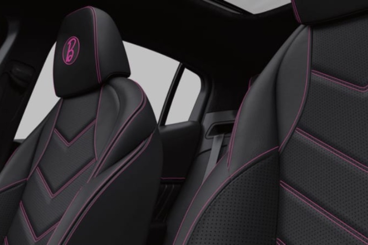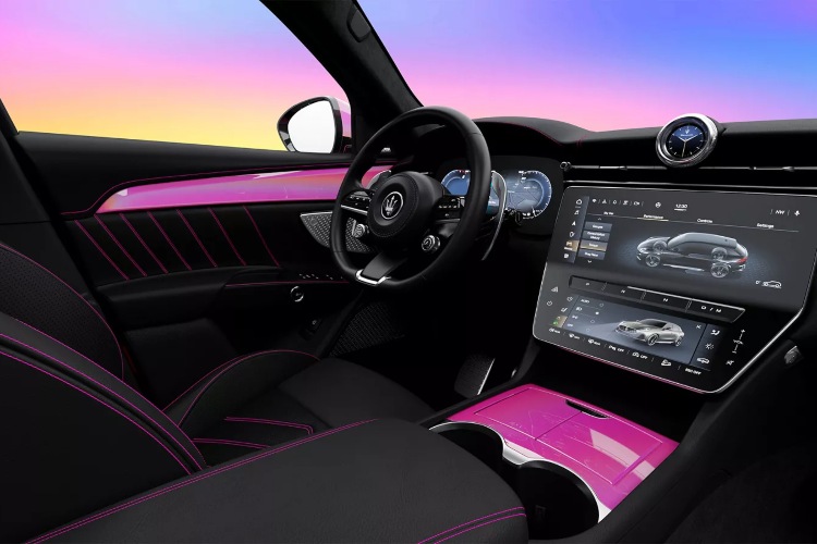 Кога станува збор за ентериерот, Barbie Maserati Grecale ја има истата розова тема, комплетирана со црн целосен кожен тапацир и контролна табла. Во кабината има розови шевови, додека потпирачите за глава се украсени со уникатно лого „B“.