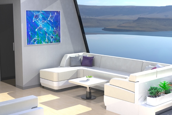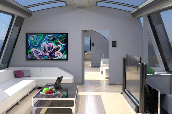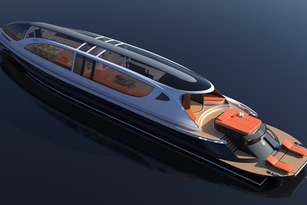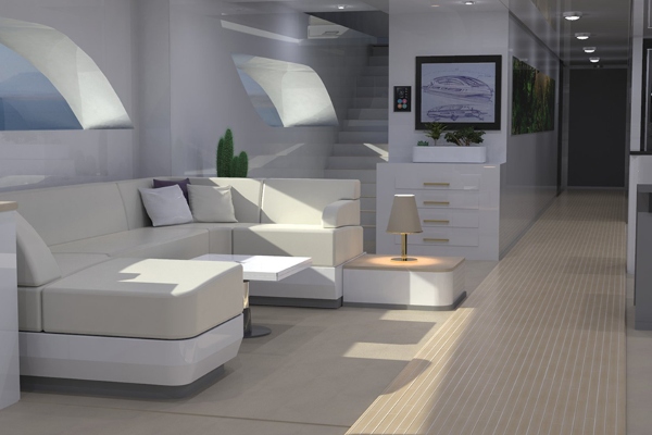 Неговиот изглед може да биде комплетно прилагоден. Овој пример има специјална прилагодлива конструкција на мост која ви овозможува директно да го насочувате багажот до влезот. На горната палуба има експанзивен салон, со три пространи станови, кујна и дневна соба на долниот кат. Во меѓувреме, играчките за вода и тендерите можат да се чуваат во затворено стебло кај строгиот.