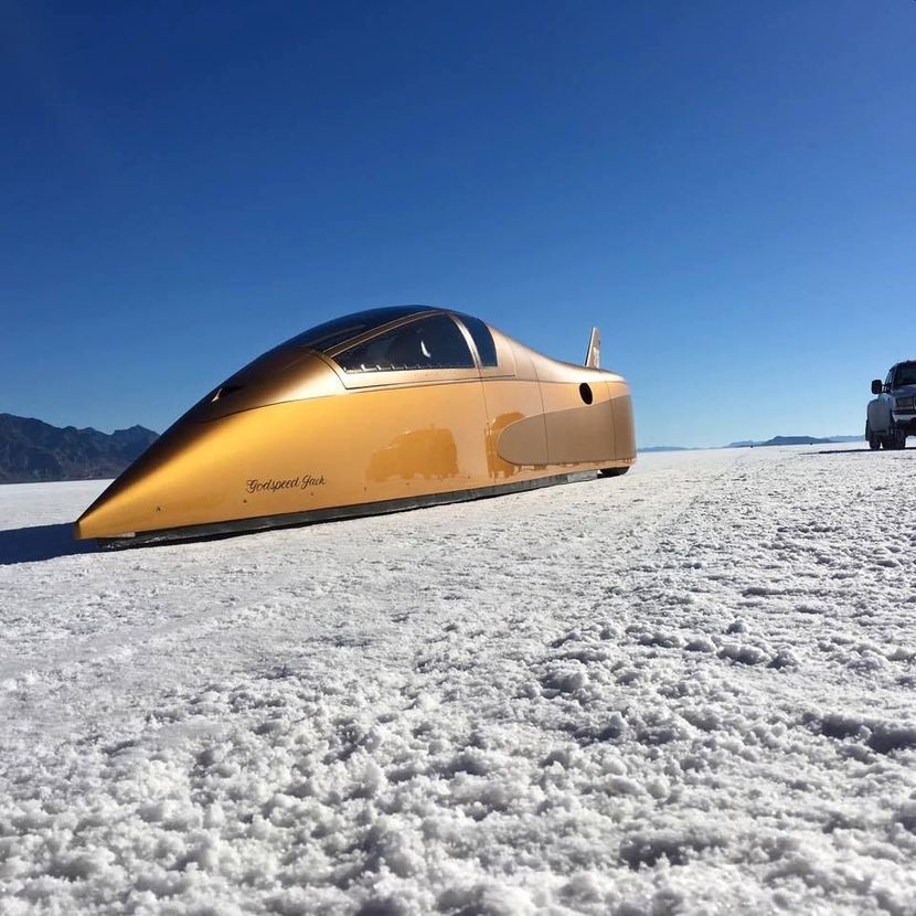Неговиот „брзински демон“, наменски направен автомобил „Брзи демон 715“, кој повеќе личи на борбен авион без крилја, достигна максимална брзина од неверојатни 470.733 милји, или 756.417 километри на час.