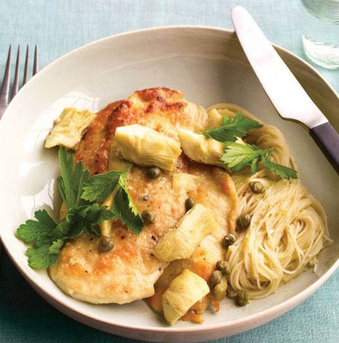 Пилешко со артичоки и шпагети Вкупно време за подготовка: 25 минути / Порции: 4 Сол и црн бибер 1/4 чаша брашно 8 тенки котлети...