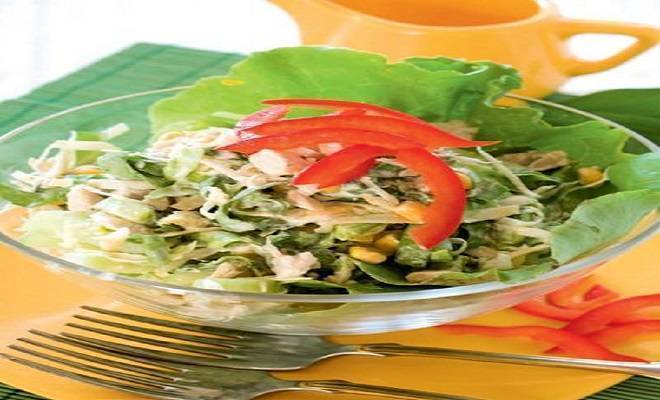 Состојки: -1 свежа краставица -1 зелена салата -400 гр. варено пилешко бело месо -1 целер -100 гр. пченка -2 дл. павлака -сок од еден...