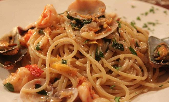 Состојки: -400 гр. мешани морски плодови -400 гр. тестенини -5 дл. неутрална павлака -40 гр. пармезан -3 парчиња лук -1 лажица сецкан магдонос -4...