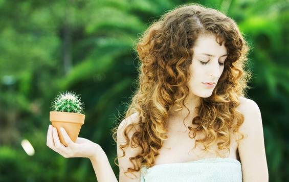 Woman holding cactus in palm, looking away